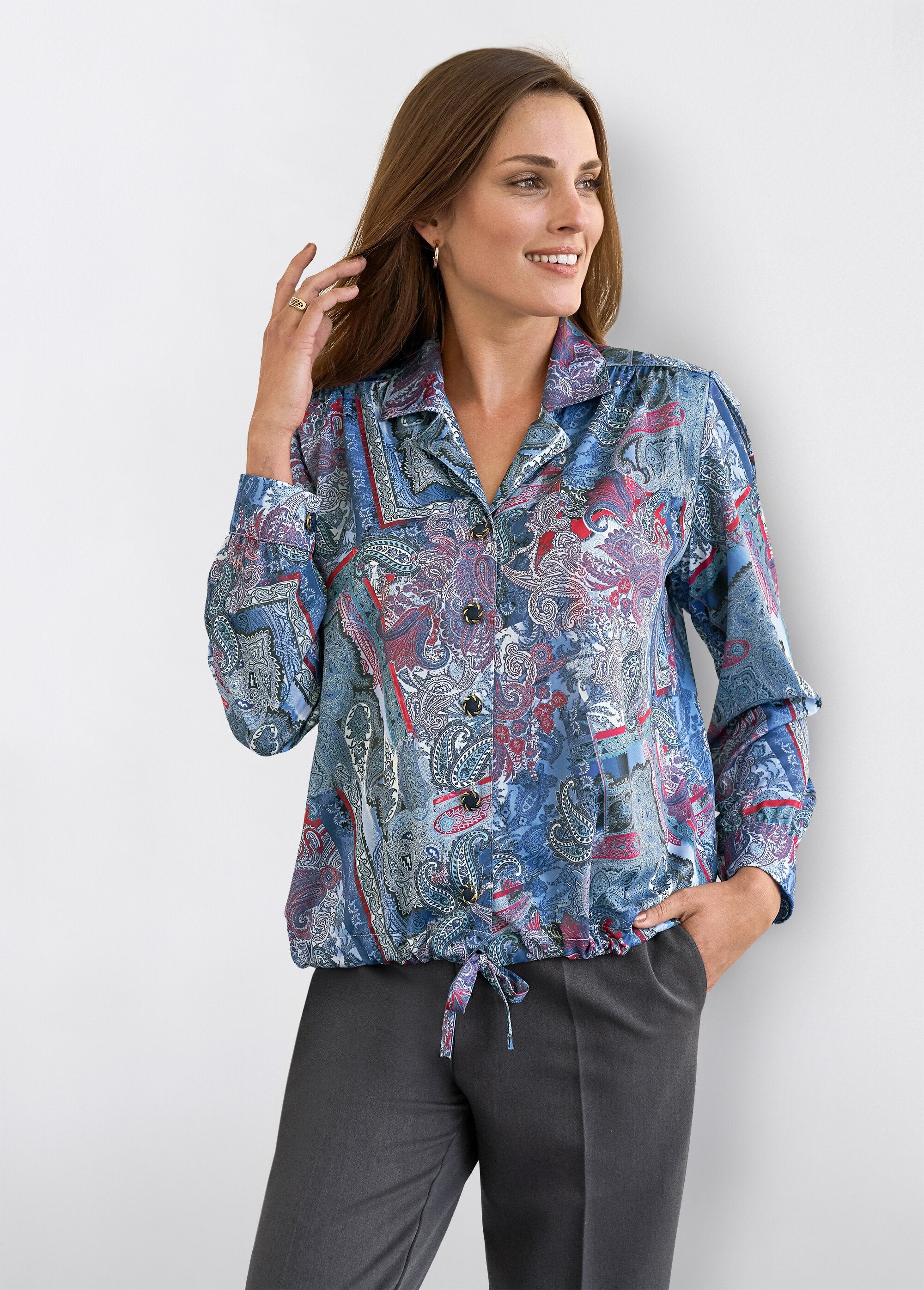 Confeccionada en un punto suave de tacto sedoso, esta blusa-blusa es ideal para realzar faldas y pantalones lisos. Cuello sastre, botones joya. Línea bellamente fruncida bajo los canesú de los hombros y ceñida en el dobladillo con una corbata corrediza. Estructura con hombros. Mangas largas ajustadas en una pulsera abotonada. Fabricación francesa.