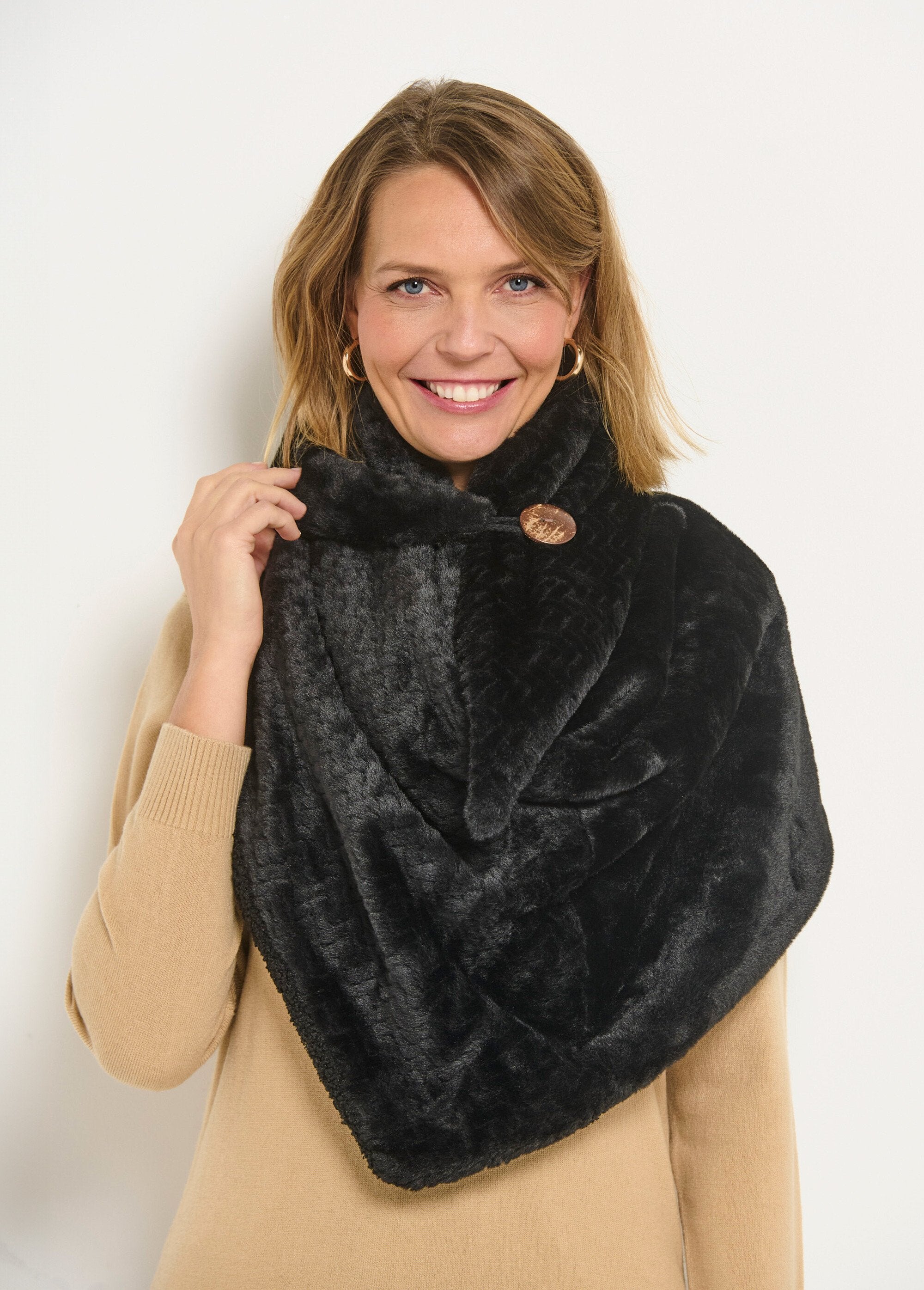 Cálido cubrehombros de piel con diseño de espiga.  Negro