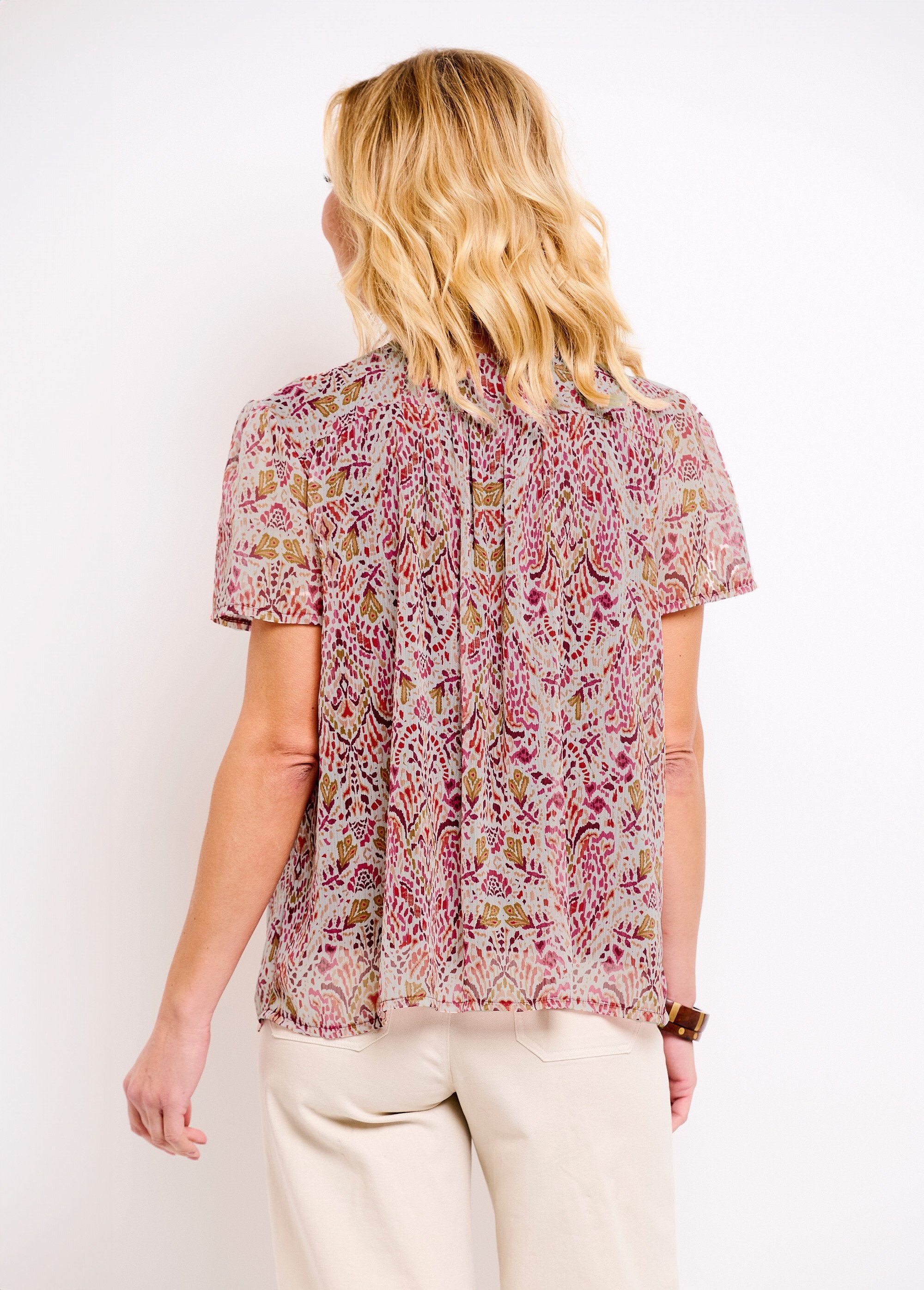 De línea recta y bonito volumen, la túnica de voile forrada combina feminidad y comodidad. Su escote en pico está marcado con un elegante anillo. El bies iridiscente en los recortes de los hombros y el canesú trasero se resaltan con fruncidos para agregar volumen. Las mangas cortas, con frunces, tienen un suave elástico. Fabricación francesa.