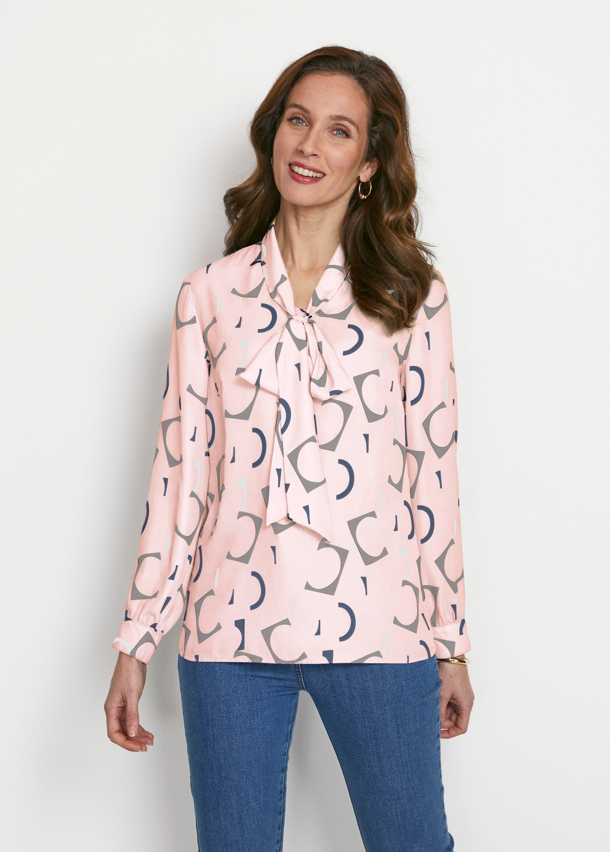 Fluida y ligera, la túnica presenta un sutil estampado gráfico. Bies unido al escote redondeado, resaltado por una abertura en V con lazos para anudar estilo lavalier. Cabezada de manga larga fruncida, puños abotonados. Base redondeada. Acabados cosidos.